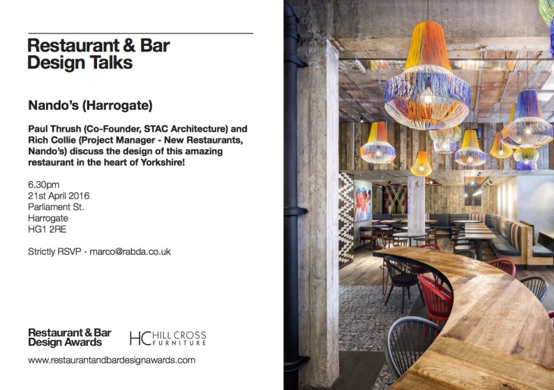 13 April 2016A Restaurant & Bar Design Awards Event – The second in our 2016 series of Restaurant & Bar Design Talks will be held at Nando’s (Harrogate) on the evening of 21st April 2016. The talk will see Paul Thrush (Co-Founder, STAC Architecture) discuss the design of this amazing restaurant in the heart of Yorkshire! The talk is presented in collaboration with Hill Cross Furniture and the BHA. The event will be photographed by Helen Collie-van de Langenberg of Rocco Photography.